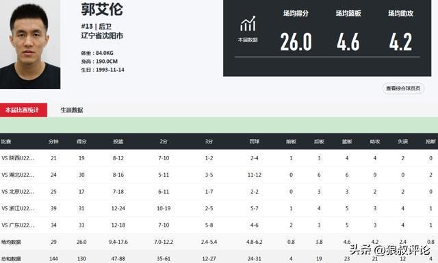 郭艾伦在上一届的全运会的表现非常出众,场均登场29分钟,得到26分4.6篮板4.2助攻,并不是很擅长的三分球投篮命中率都可以场均投中2.4个。
